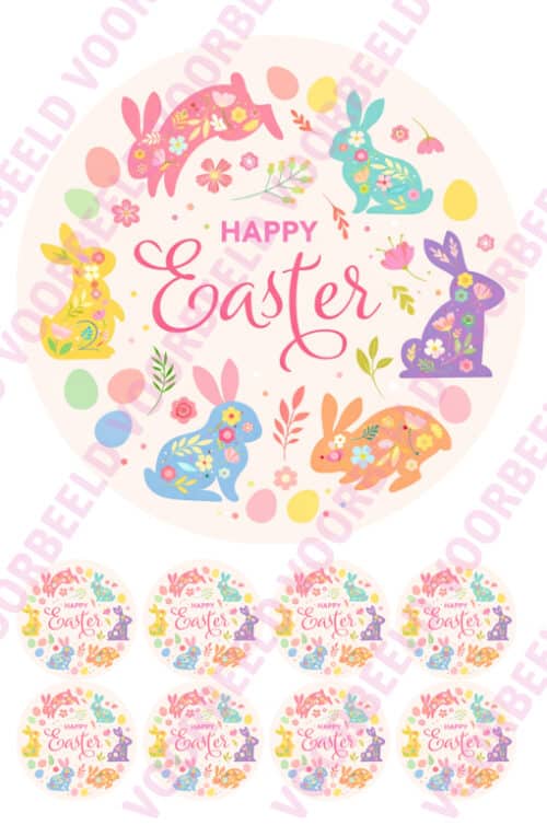 Eetbare Taartprint Happy Easter Pastel Bunny’s – 18 cm rond rond + 8 cupcake rondjes