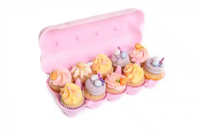Super leuk deze roze eierdozen. Presenteer hierin jouw Paas mini cupcakes of andere sweets. De doos kan ook goed gesloten worden met mini cupcakes erin.
