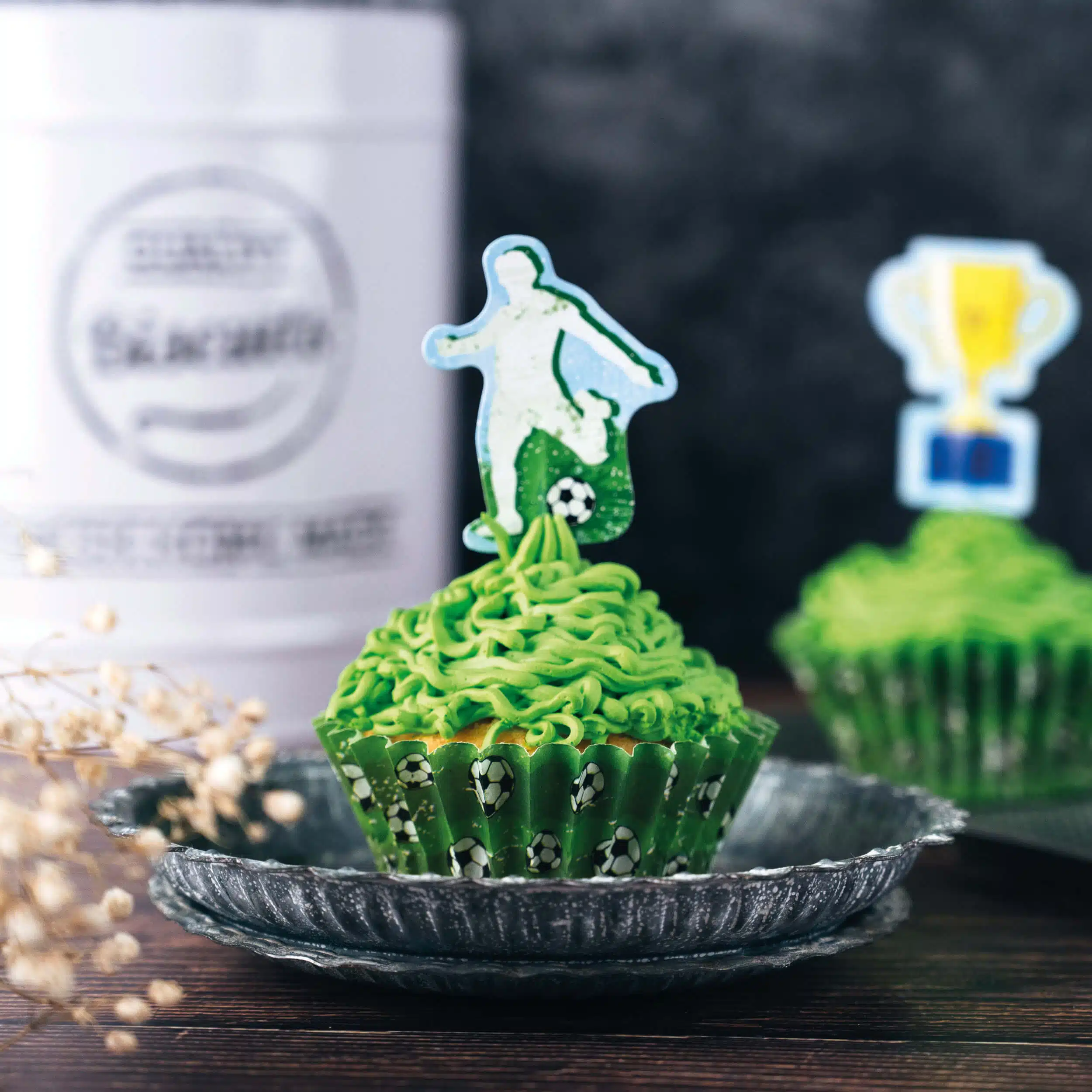Leuk cupcake pakket met cupcakebakjes en prikkers in voetbal thema.