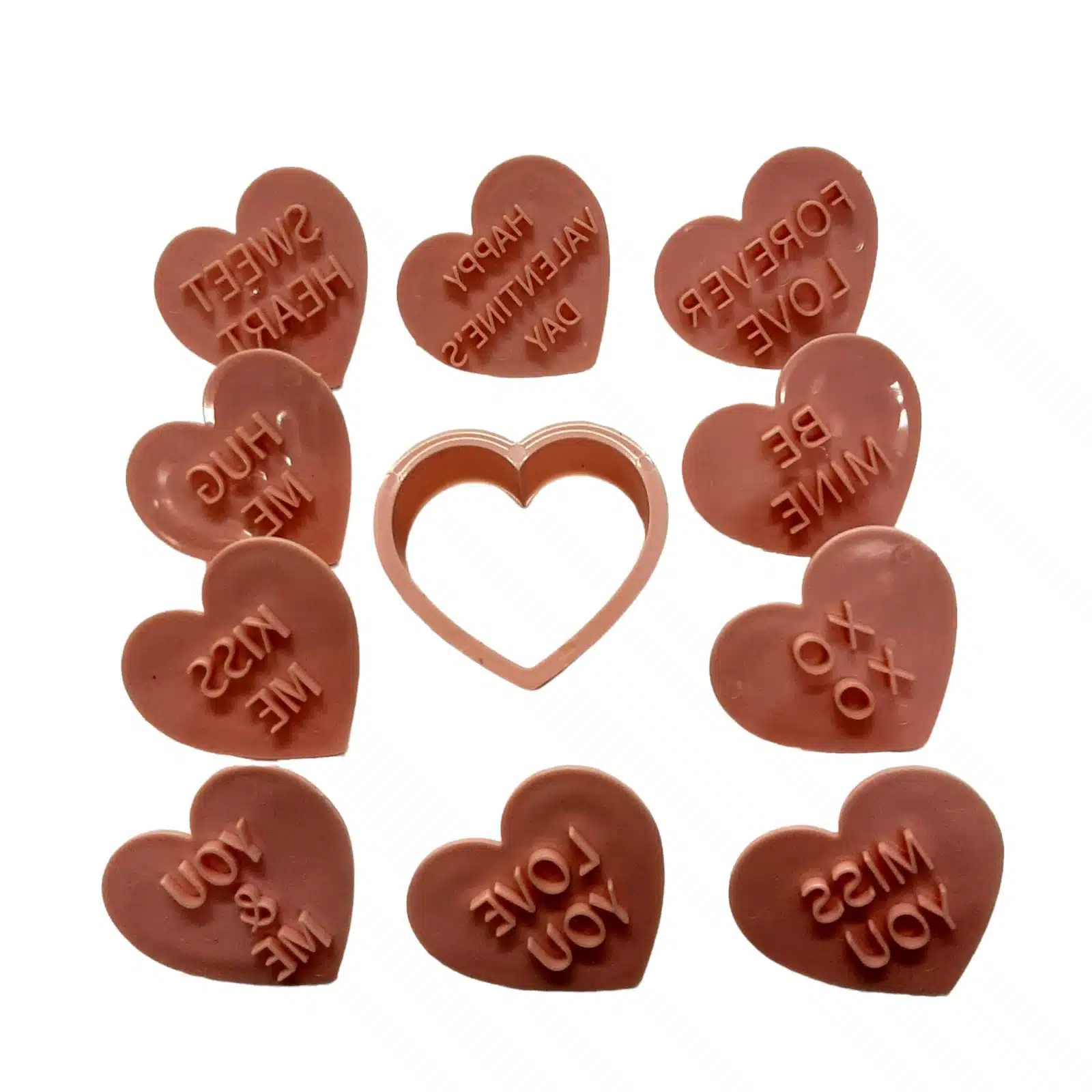 Leuke impressie set met hartjes uitsteker waarmee je koekjes kan maken met teksten. Leuk voor Valentijn! Teksten zoals “hug me”, “kiss me”, “be mine”, “forever love”, “sweet heart”. Ook goed te gebruiken met fondant en marsepein.