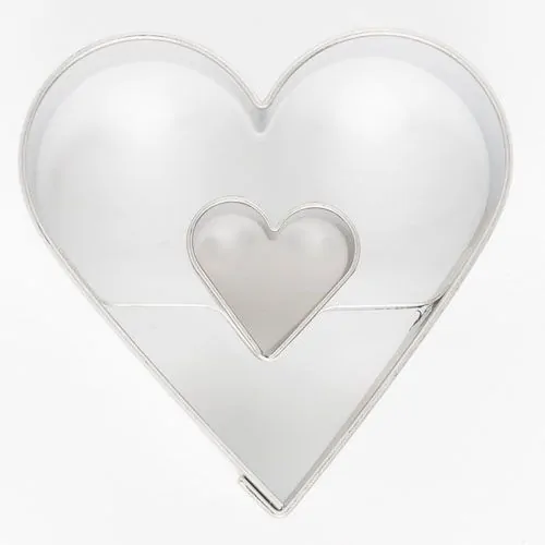 Lieve koekjes uitsteker in de vorm van een hart. Deze metalen uitsteker heeft in het midden een klein hartje zodat je eenvoudig leuke koekjes of fondant decoraties kunt maken. Leuk voor Valentijnsdag of Moederdag! Afmeting: 4,5 cm.