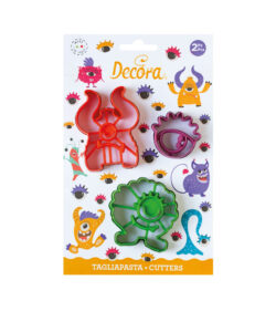 Plastic Koekjesuitsteker set van Decora van drie verschillende monstertjes. Leuk voor al jouw Halloween koekjes! Ook geschikt om fondant of marsepein mee uit te steken.