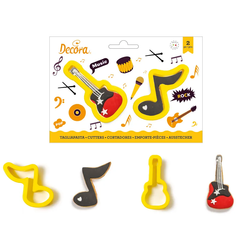 Plastic Koekjesuitsteker set van Decora van een Gitaar en een Muzieknoot. Tip: Door de mooie verpakking ook erg leuk om cadeau te geven! Afmetingen: Gitaar: 9 x 4 cm en Muzieknoot 6 x 7 cm