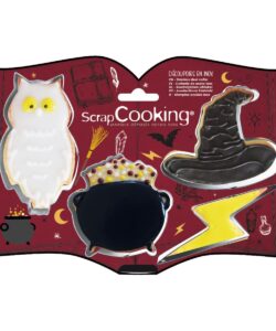 Het product omvat 4 verschillende vormen: een uil, een hoed, een ketel en een bliksemschicht. Gebruik deze uitsteker om je desserts uit koekjesdeeg, suikerpasta of zelfs marsepein te snijden. Maak van je taarten betoverende kunstwerken!
