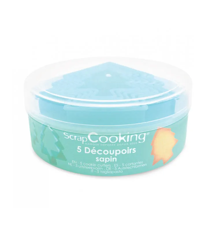 Set van 5 Kerstboomuitstekers om mooie kerstboomkoekjes te maken. Berg ze gemakkelijk op in hun doos! Ook te gebruiken voor het uitsteken van fondant of marsepein, maar ook geschikt voor het maken van kerstbomen van komkommer, kaas en brood.