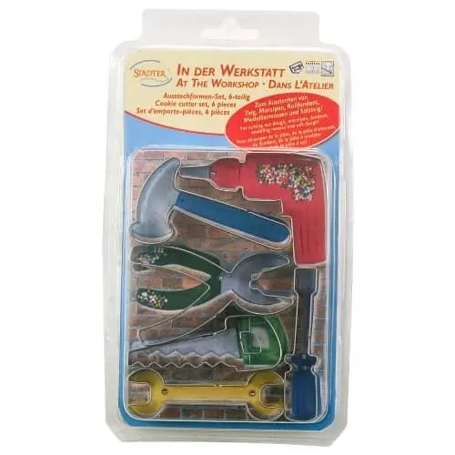 6 delige metalen koekjes uitsteker set Gereedschappen. Inhoud Hamer, boor, tang, zaag, schroevedraaier, sleutel. Afmetingen ca 7cm. Gemaak van roestvrij metaal. Geschikt voor de vaatwasser.