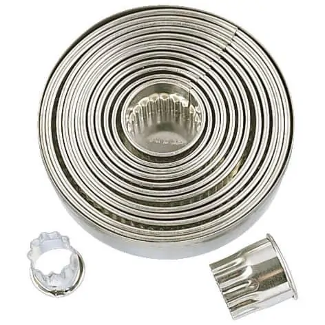 14 delige gekartelde ringen set in blik met doorsnedes van 2,5 tot 10,5 cm (per cm oplopend). Niet geschikt voor de vaatwasser.