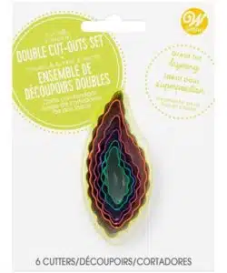 Maak leuke fondantvormpjes om je taarten en koekjes te versieren met deze set dubbelzijdige blad uitstekers. Deze duurzame collectie blad uitstekers heeft een rechte en een gekartelde kant. Rol je fondant uit en druk de uitsteker gelijkmatig door het fondant om je vorm uit te snijden. Elke cutter is gemaakt van gekleurd metaal en de uitstekers kunnen in elkaar worden geplaatst zodat ze gemakkelijk kunnen worden opgeborgen. Deze set blad uitsekers bevat zes verschillende maten en zijn ideaal voor het maken van fondantvormen en andere decoraties.