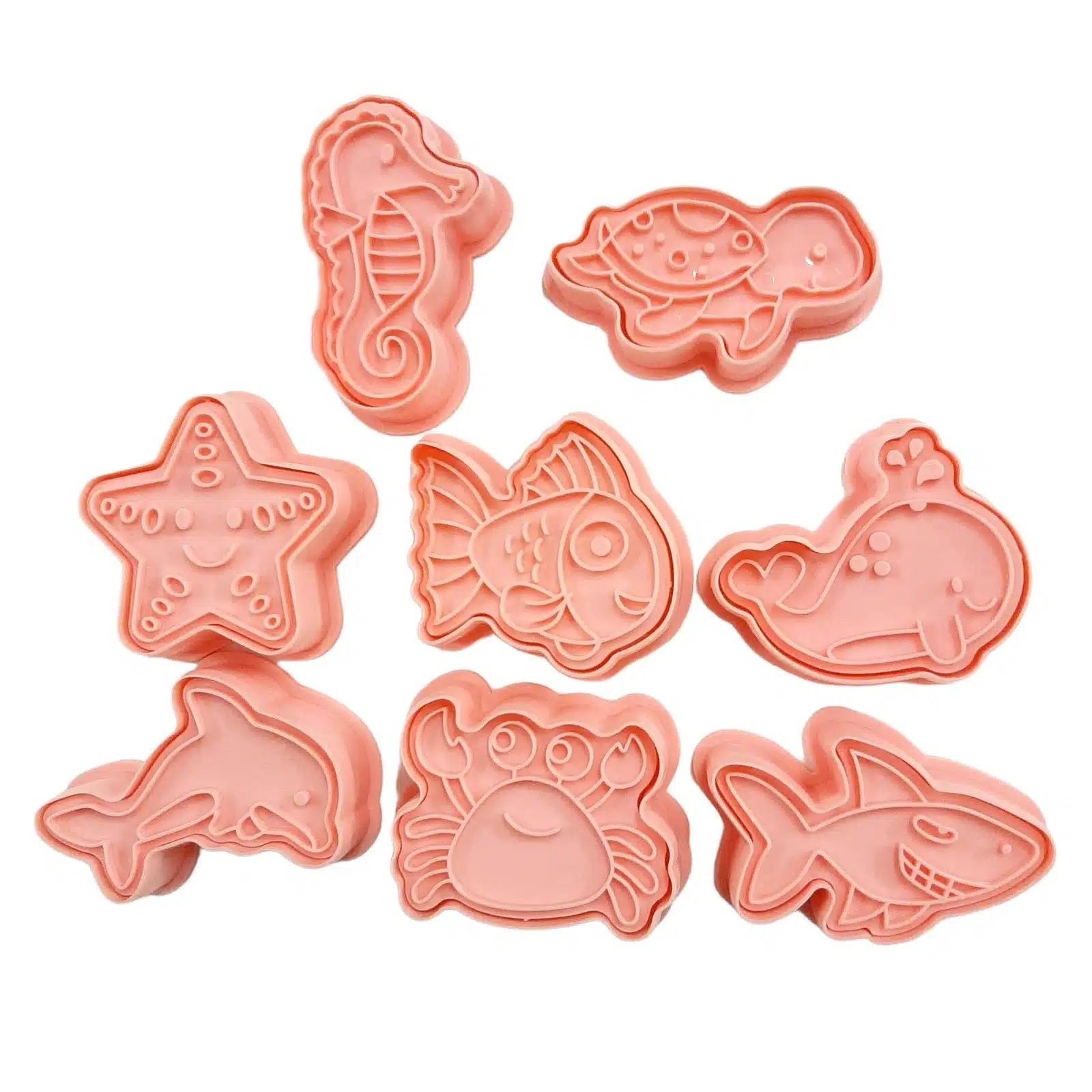 Leuke set met uitstekers met impressie in zee thema voor het maken van koekjes met impressie of fondant/marsepein decoraties voor op taart, cupcakes, cakepops en macarons. De set bevat uitstekers van een: zeepaardje, dolfijn, walvis, zeester, haai, schilpad, krab en een vis.