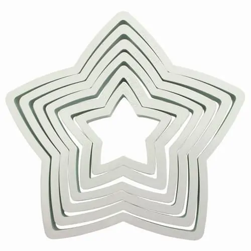 Deze stervormige plastic uitstekers van PME zijn ideaal voor het uitsteken van koekjesdeeg. Maar ook prima te gebruiken voor marsepein, fondant en andere traktaties. Daarnaast zijn deze uitstekers stevig, waardoor ze ook geschikt zijn voor kinderen. Deze zesdelige uitsteker set is gemaakt van zeer sterk kunststof dat voldoet aan de voedselkwaliteit eisen. Afmeting: Small – 4 cm Medium – 5,6 cm Large – 7,5 cm XL – 8,7 cm XXL – 10,2 cm XXXL – 11,8 cm Inhoud: 6 stuks.