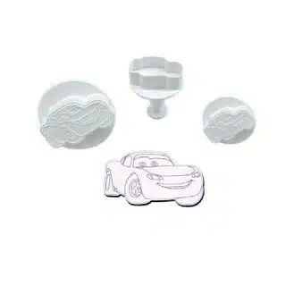 Leuke plunger set voor het maken van fondant of marsepein decoraties op bijvoorbeeld taarten, cupcakes, macarons, koekjes en cakepops. In de vorm van een Cars auto in drie maten.