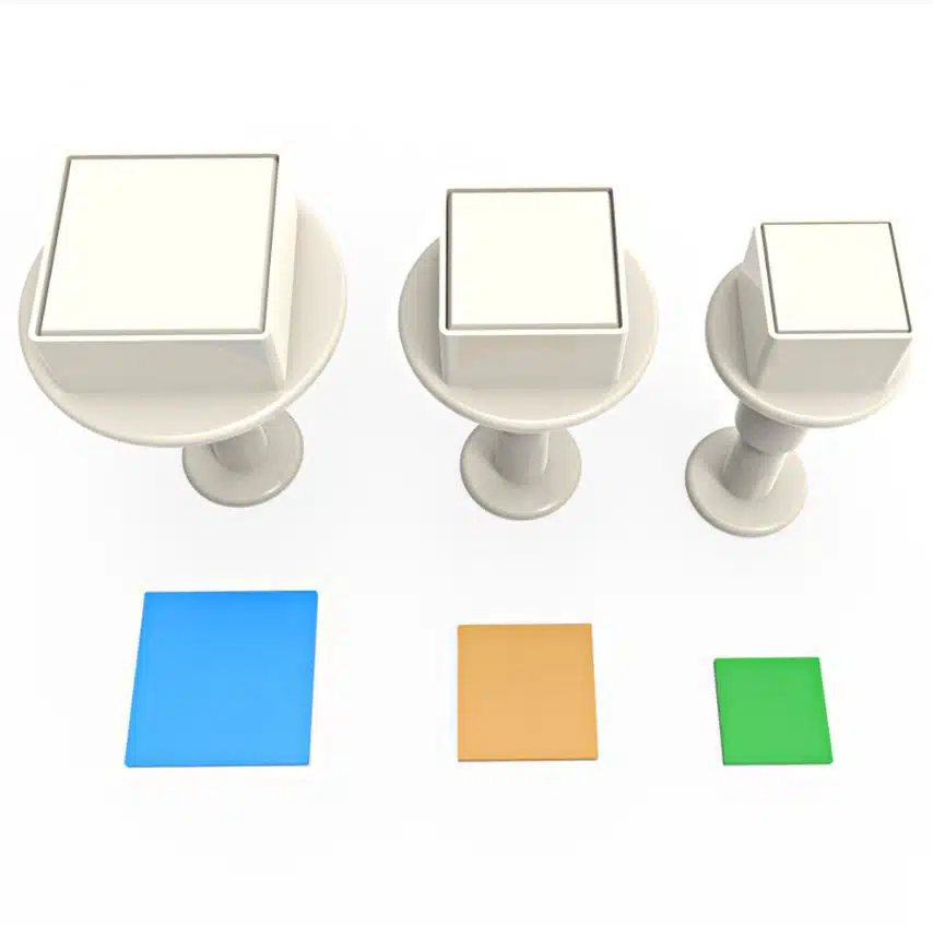 Handige plunger set voor het maken van fondant of marsepein decoraties op bijvoorbeeld taarten, cupcakes, macarons, koekjes en cakepops. In de vorm van een vierkant in drie maten.