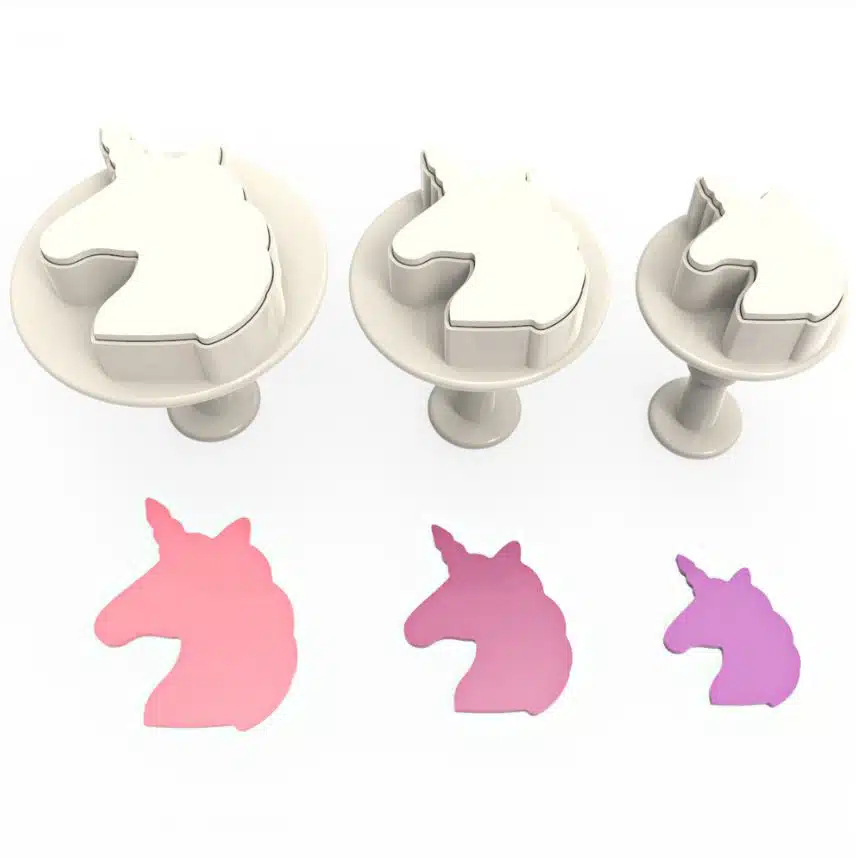Leuke plunger set voor het maken van fondant of marsepein decoraties op bijvoorbeeld taarten, cupcakes, macarons, koekjes en cakepops. In de vorm van een Eenhoorn hoofd in drie maten.