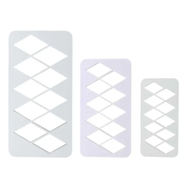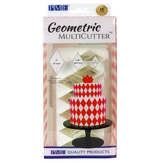 Diamonds are a cake’s best friend. Maak de mooiste taarten met de Geometric Multicutter Diamond XL Set van PME. Deze uitstekers zijn ontworpen voor perfect resultaat; je kunt er super gemakkelijk prachtige geometrische taartdesigns mee maken. De uitstekers steken scherp uit en kunnen gebruikt worden met rolfondant, marsepein, gum paste, modelling candy en niet-eetbaar materiaal zoals polymeer klei. Het is een geweldige tool voor beginners maar ook voor de professionele taart decorateurs en thuisbakkers. Deze set bevat drie uitstekers in drie verschillende formaten. Hoe te gebruiken: rol simpelweg de fondant uit, druk de uitsteker op de uitgerolde fondant en steek uit. Deze sterke en duurzaam uitstekers zijn gemaakt van hoge kwaliteit voedselveilig plastic. De uitstekers zijn verpakt in een helder plastic doosjes en bevat de volgende talen: Nederlands, Engels, Frans, Spaans en Duits. Afmeting small: circa 1,9 cm. Afmeting medium: circa 2,5 cm. Afmeting large: circa 3,2 cm.
