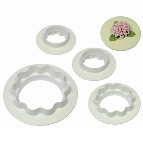 Set v 4 uitstekers in zowel ronde als wavy vorm. Aan 2 kanten te gebruiken voor diverse doeleinden. Denk bijv. aan snijden van fondant/marsepein voor het bekleden van een cupcake. Afmetingen ca. 2,5cm, 3,5cm, 5cm en 7cm. doorsnede.
