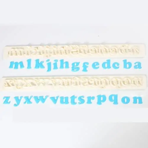 FMM tappit uitstekers in Art Deco stijl. Deze liniaal vormige uitsteker set is ideaal om letters te maken. Dit is de “kleine letter” set, compleet van A t/m Z. Formaat van de letters is circa 1,5 cm. De set bestaat uit 2 linialen en een ingesloten Engelse instructie. Deze liniaal werkt het beste als je de marsepein of fondant (gemend met wat tylo poeder) goed door kneed en daarna zeer dun uitrolt. De gewenste letter uitdrukken en daarna uit de liniaal kloppen.