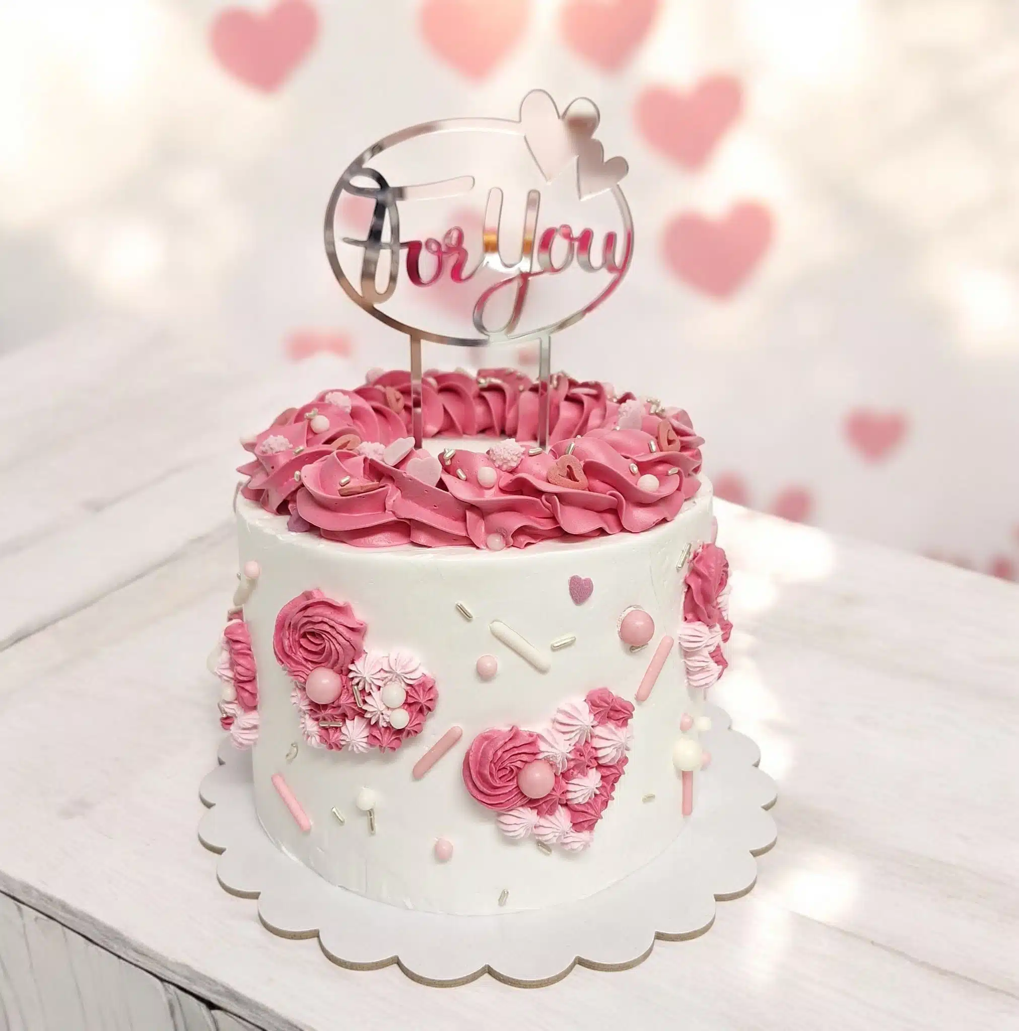 Tijdens deze workshop gaan we een dubbele biscuit van 15 cm doorsnede drie keer vullen en strak leren afsmeren met Enchanted Cream. Daarna ga je met verschillende spuittechnieken en spuitmondjes aan de slag om de versiering bovenop de taart en de hartjes aan de zijkant te maken. Je maakt het geheel af met bijpassende sprinkels.
